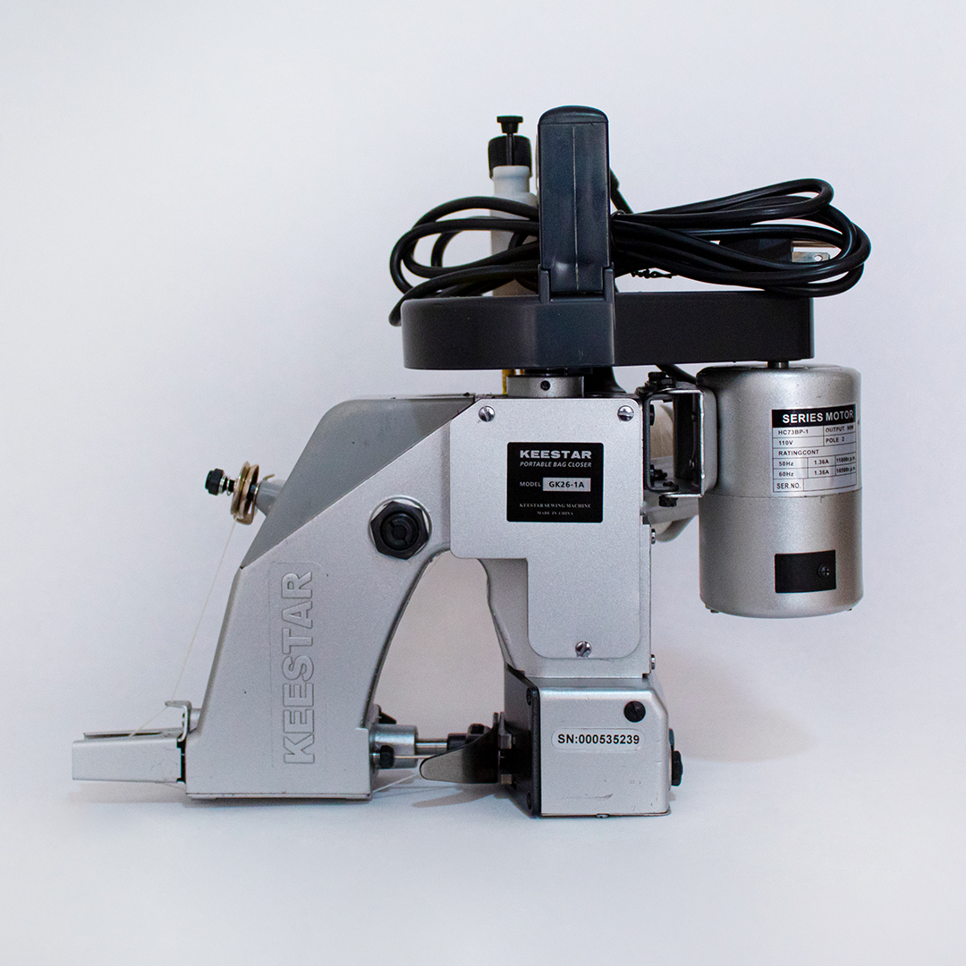 Cosedora industrial modelo GK-26-1A, ideal para el cerrado de sacos o bolsas de papel, yute o polipropileno. Compacta, portátil y de alto rendimiento, ampliamente usada en agroindustria, bodegas y fábricas.