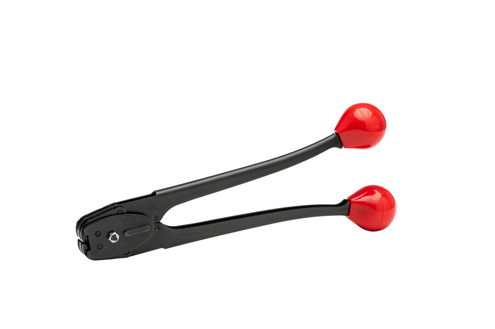 Tenaza robusta de acero diseñada para sellar zunchos metálicos de 5/8" y 1/2". Herramienta de alta resistencia para trabajos industriales de amarre.